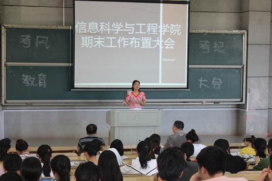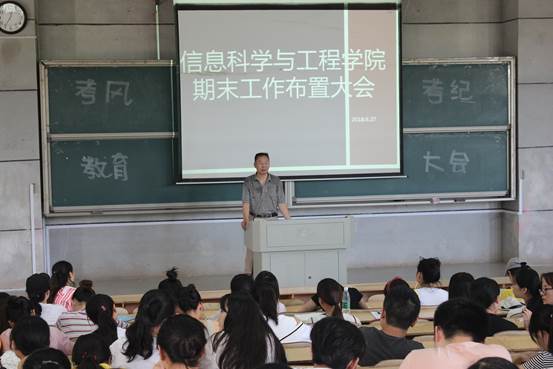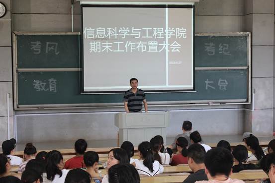 为进一步加强学院学风建设,端正考风考纪,明确诚信参考意识,保证期末考试的顺利进行。6月27日中午,信息科学与工程学院于理报厅一召开期末工作布置大会。学院党总支书记王杰文教授,副院长王建军教授,党总支副书记易利老师,学工办关红儒和唐瑞鸿老师出席会议,各班班干部、学院学生干部及学生党员共计200余人参加此次会议。大会由关红儒老师主持。