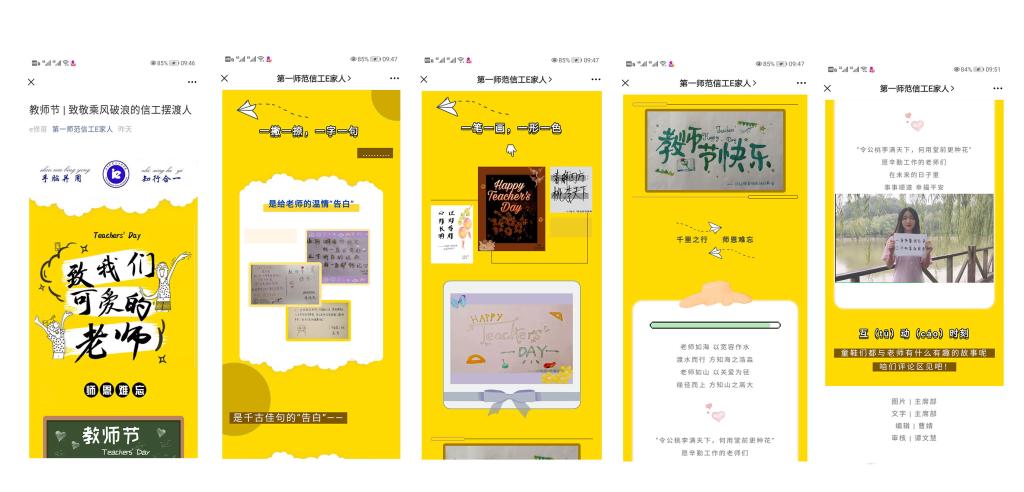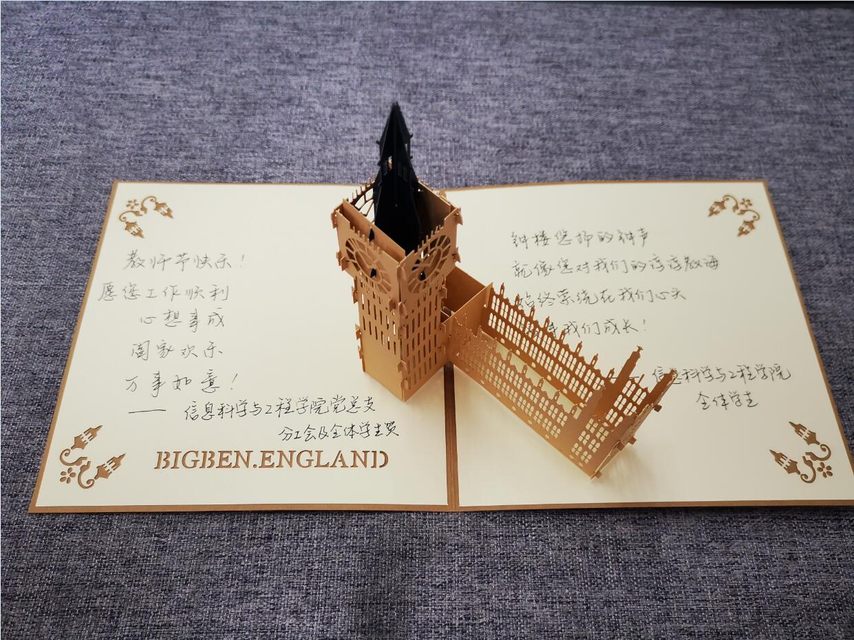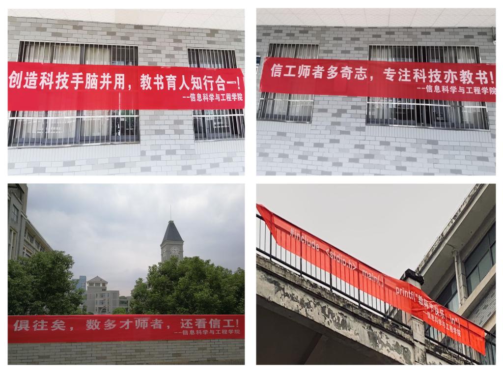 “学而不厌,诲人不倦!桃李不言,下自成蹊!祝老师顺心顺意,幸福安康!”精炼而深情的祝福语,写在了精心定制的贺卡上。“信工师者多奇志,专注科技亦教书”“E家人在一起,暖暖的,很贴心!”鲜艳的条幅悬挂在学院附近,让人看上去心暖意融。“老师如海,以宽容作水;渡水而行,方知海之浩淼。老师如山,以关爱为轻;缘径而上,方知山之高大。”精彩而特殊的微信推送,化作信鸽飞送到每一位老师的心坎里……