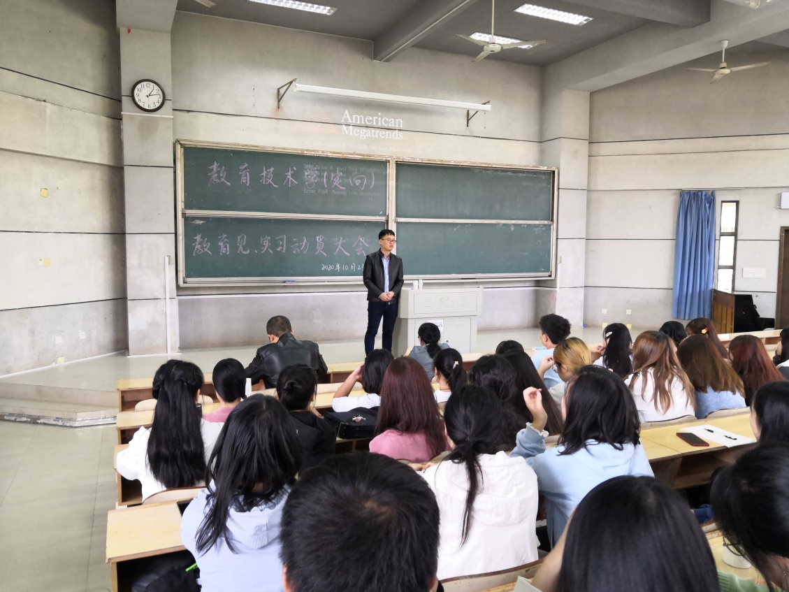 10月23日中午,必赢官网组织2018、2019级六年制教育技术学专业全体学生,在润寰南105召开了2020年教育见习及教育实习动员大会。学院副院长何向阳、党总支副书记成夏炎及带队教师祁玉娟、刘琳出席,小学信息技术教育教研室主任黄悦主持大会。