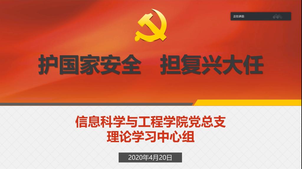 4月20日上午,必赢官网党总支理论学习中心组通过腾讯会议系统线上开展主题为“护国家安全,担复兴大任”的集中学习。会议由学院党总支书记王杰文主持。