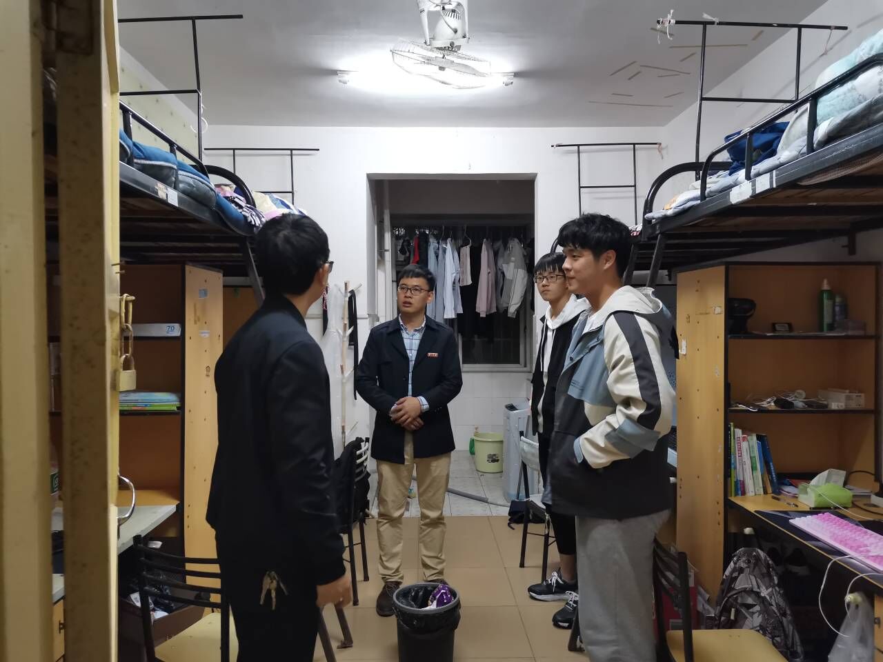 田祖伟院长在查看内务的同时也不忘关心学生:“同学们在平时的生活中不仅要友爱互助,更要重视安全卫生,树立优良寝风,助益学习成绩提高和个人健康成长。”