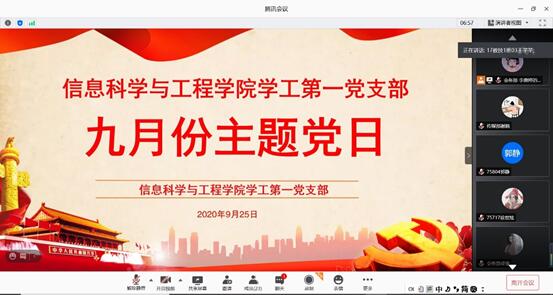 2020年9月25日,必赢官网学工第一党支部、第二党支部分别开展了九月份线上主题党日活动。一同参加主题党日活动的有学院党总支副书记成夏炎、学工办全体辅导员以及两个支部的学生党员。王芊芊、全智分别主持各自所在支部的活动。