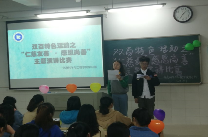 (通讯员 郭雅洁 颜海霞)为促使学生深入理解社会主义核心价值观内涵,引导学生传承并弘扬中华传统文化和中华民族优秀美德,争做仁慈友善、感恩尚善的新时代青年,信息科学与工程学院于2019年5月7日19点在玉衡北410开展双百特色活动之“仁慈友善·感恩尚善”主题演讲比赛。