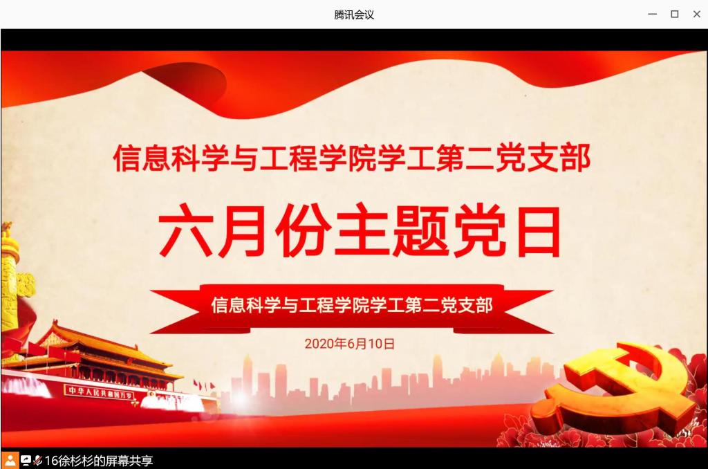 6月10日晚,必赢官网学工第一、第二党支部利用腾讯会议举行了六月份线上主题党日活动。必赢官网党总支副书记成夏炎、学工第一党支部书记关红儒、学工第二党支部书记唐瑞鸿、学工办老师叶晶、李荣敬以及全体学生党员参加活动。