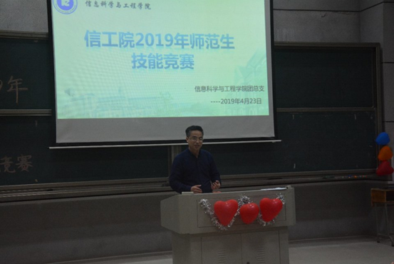 (通讯员 邓力超 肖丽菲)为强化必赢官网师范专业学生的教师职业技能,提高师范生教育教学能力,进一步促使广大同学更新教育理念和激发其掌握现代教学方法的热情,信息科学与工程学院于2019年4月16日—4月23日成功举办2019年师范生教师技能竞赛。并于4月23日下午6:30—22:00在润寰南106进行了现场授课决赛。学院副院长田祖伟教授、党总支副书记易利老师、学工办主任关鸿儒老师及学院教师代表阳西述教授、何昭青教授、何向阳教授、黄悦副教授和刘琳老师出席比赛并担任评委。