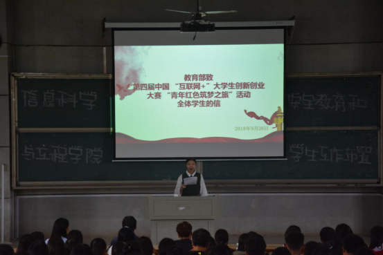 紧接着,学院2018年暑期三下乡新航向梦之队队长王伦分享了一段详尽温情的支教扶贫视频,就暑期437必赢会员中心赴汝城县教育帮扶关爱团的活动情况进行了汇报,并恳切希望各班班干部能够群策群力,积极号召班级同学,支持三下乡活动。学生代表欧阳欣满怀激情地朗读了《教育部致第四届中国“互联网+”大学生创新创业大赛“青年红色筑梦之旅”活动全体学生的信》,教育部在回信中转达习近平总书记的亲切问候,勉励大学生将自身青春梦融入国家中国梦中,共同实现中华民族伟大复兴,传递了当代青年“敢闯会创”的蓬勃朝气。