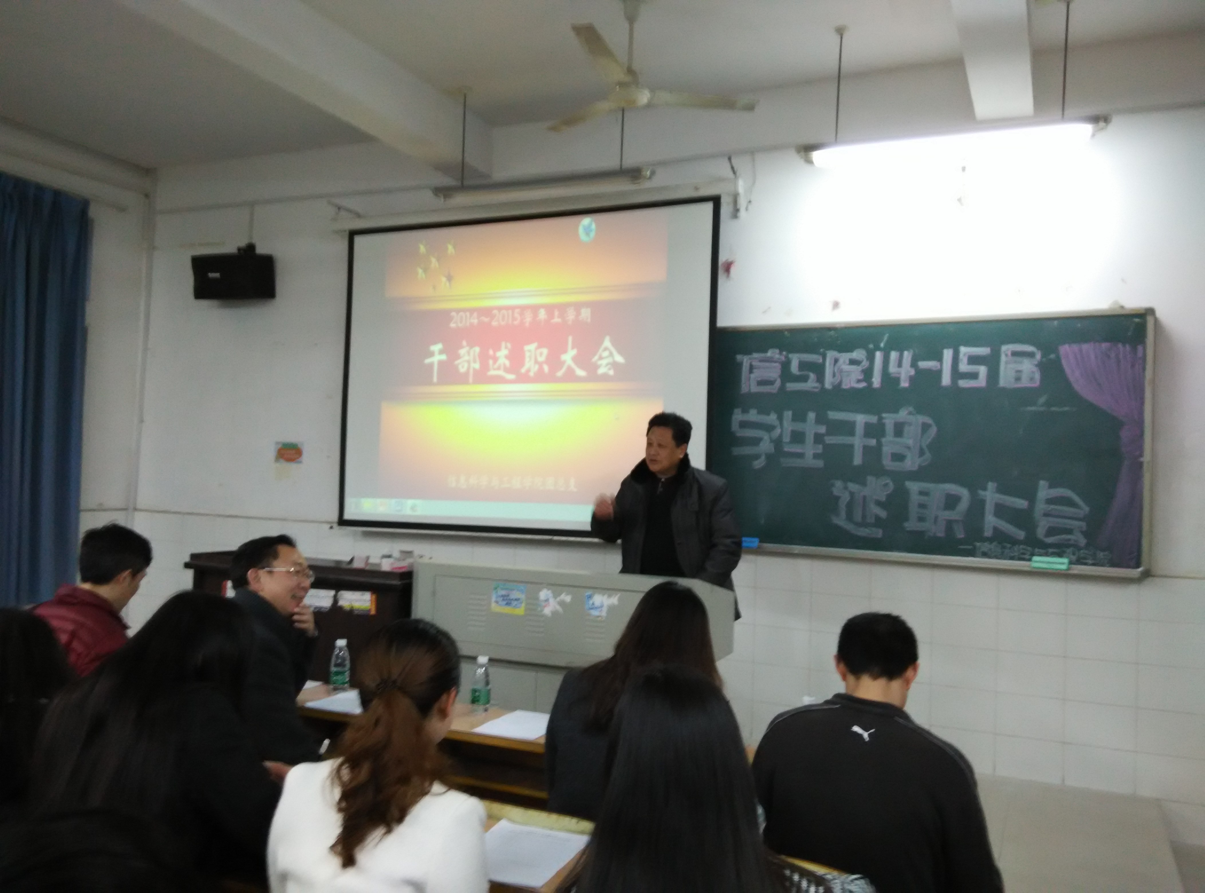 (通讯员 丁青 易利) 为加强学生干部之间的交流,进一步做好团学工作,2015年3月16日晚,信息科学与工程学院团总支在理科楼B栋301教室隆重举行了2014-2015届学生干部述职大会。院党总支王杰文书记、张如健副书记、教务办主任李卫东应邀参加此次会议,此外还有团总支书记易利、辅导员关红儒、李豪杰老师及各班代表。