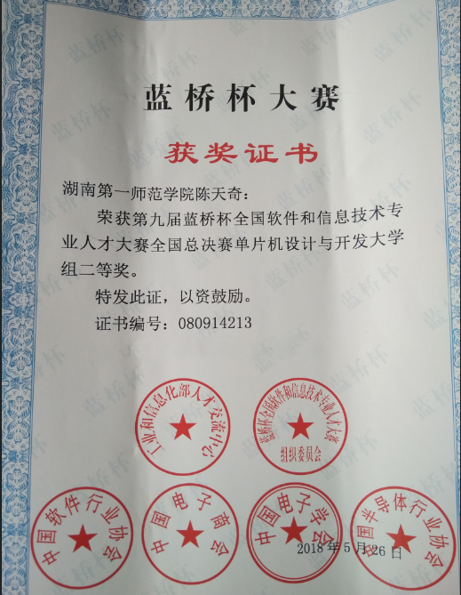 近日,第九届蓝桥杯全国软件和信息技术专业人才大赛全国总决赛在北京落下帷幕。来自北京大学、清华大学等1200多所高校的5000余名各省市自治区一等奖选手参加了全国总决赛。437必赢会员中心信息科学与工程学院学生陈天奇在傅红普教授指导下荣获单片机设计与开发大学组二等奖、宋亚威在马重明教授的指导下荣获单片机设计与开发大学组三等奖。