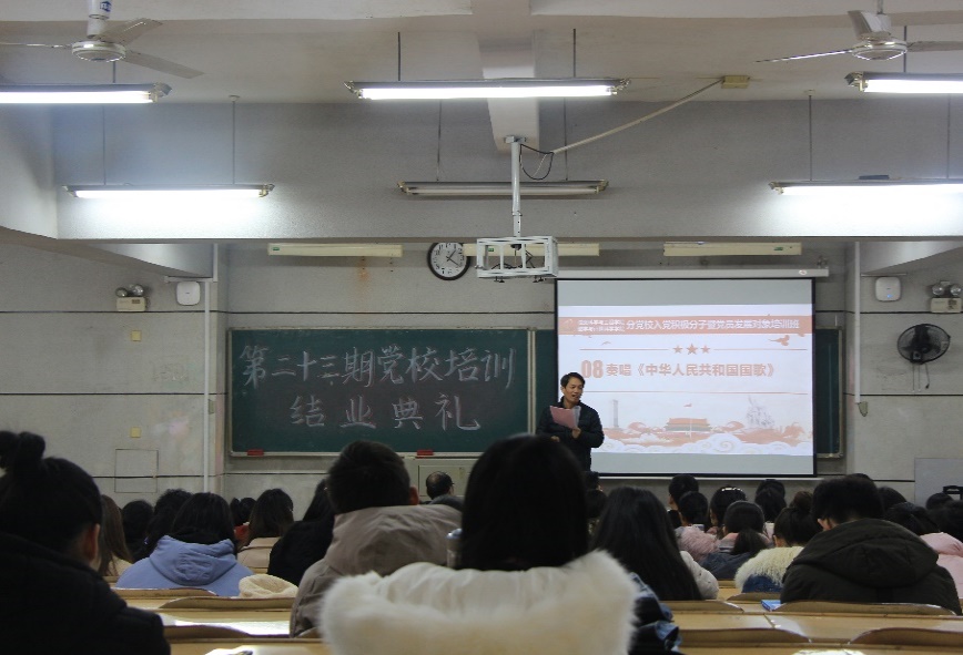 2019年12月19日12:40,信息科学与工程学院分党校、数学与计算科学学院分党校于润寰南101教室联合举办第二十三期入党积极分子与发展对象党校培训结业典礼。两院院领导、分党校校务委员、学工办辅导员老师应邀出席,两院入党积极分子和发展对象共139名学员以及相关工作人员参加此次结业典礼。