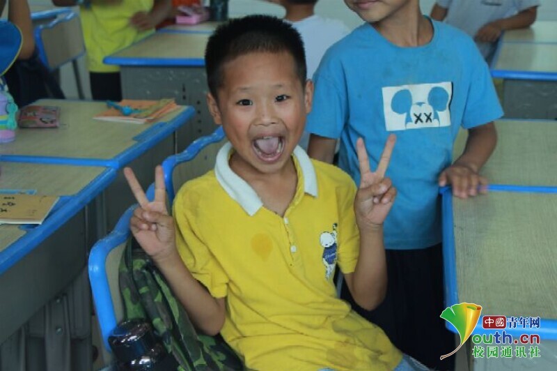图为受到“小老师”表扬后兴高采烈对着镜头比“耶”的小朋友。中国青年网通讯员 何星逸 摄