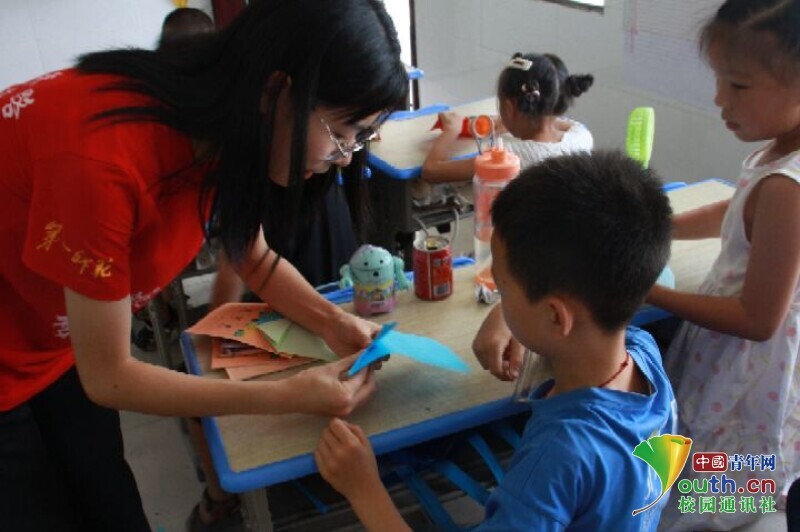 图为队员耐心地手把手教小朋友们做手工,小朋友们热情高涨,兴趣浓厚。中国青年网通讯员 何星逸 摄