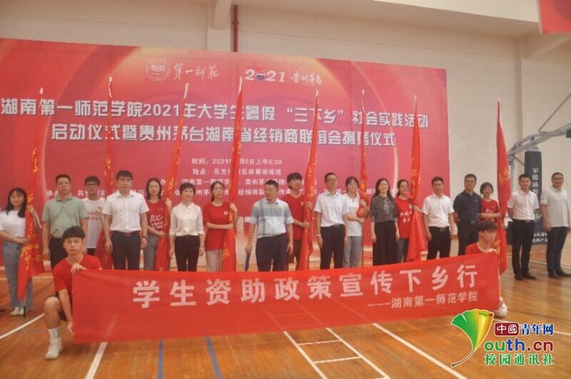 图为437必赢会员中心“三下乡”实践活动启动仪式,学校领导为各学院三下乡负责人授旗。中国青年网通讯员 欧阳健 供图