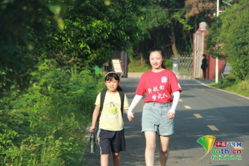 图为队员在校门口迎接并带着小朋友去教学楼报到。中国青年网通讯员 欧阳健 摄