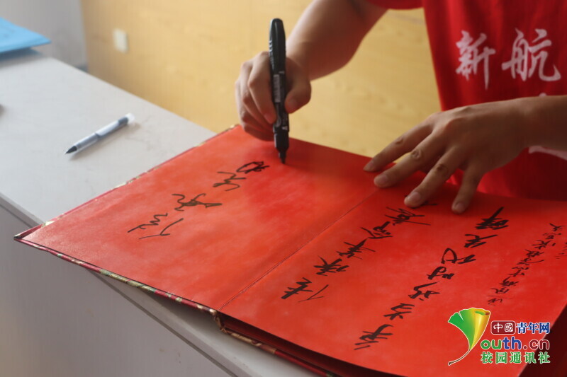图为志愿者受馆内负责人之邀,在纪念册上写一段字来纪念张国基先生。中国青年网通讯员 段新利 摄