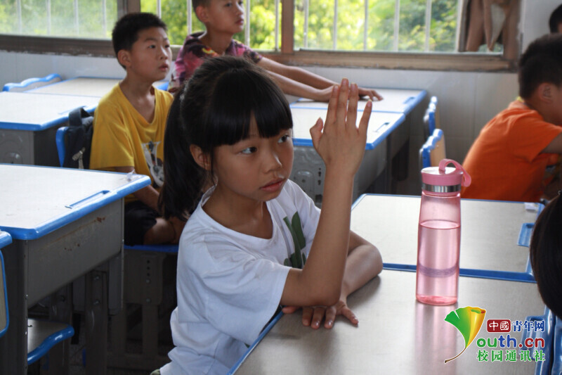 图为趣味手工课上班级同学在老师的鼓励下试探性的举起小手,勇敢尝试在全班面前展示自己的作品。中国青年网通讯员 欧阳健 摄