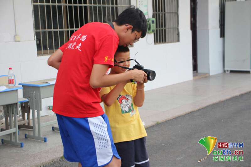 图为学生小新在老师的耐心指导下和帮助下使用相机,自信地给老师拍了一张“写真”。中国青年网通讯员 欧阳健 摄