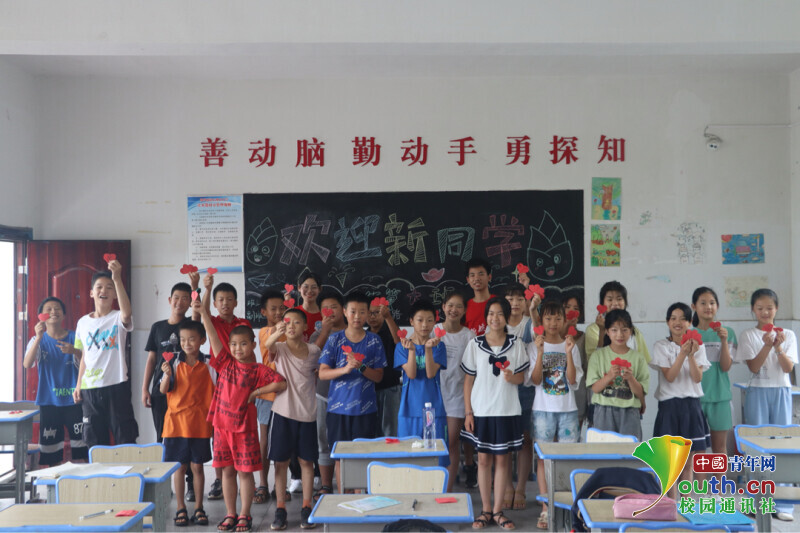 图为下课后,新航向·梦之队队员和学生们手拿红心,献礼祖国的合影。中国青年通讯员 段新利 摄
