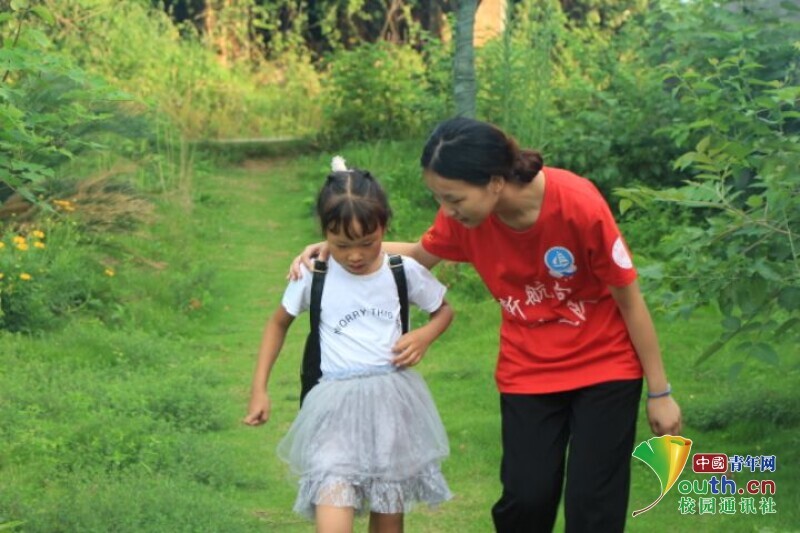图为志愿者老师弯腰询问小女孩的住处,护送孩子回家。中国青年网通讯员 欧阳健 摄