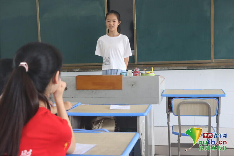 图为朗诵课上,志愿者老师鼓励班上同学积极竞选文艺汇演主持人,学生郭以璇勇敢地走上了讲台,大方地介绍自己。中国青年网通讯员 段新利 摄