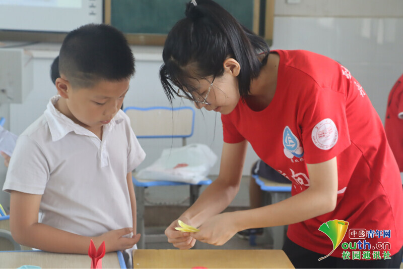 图为趣味手工课上,学生遇到了困难,志愿者老师立马俯下身子,轻声细语地询问甚至借助演示来告诉学生折纸方法和技巧。中国青年网通讯员 段新利 摄