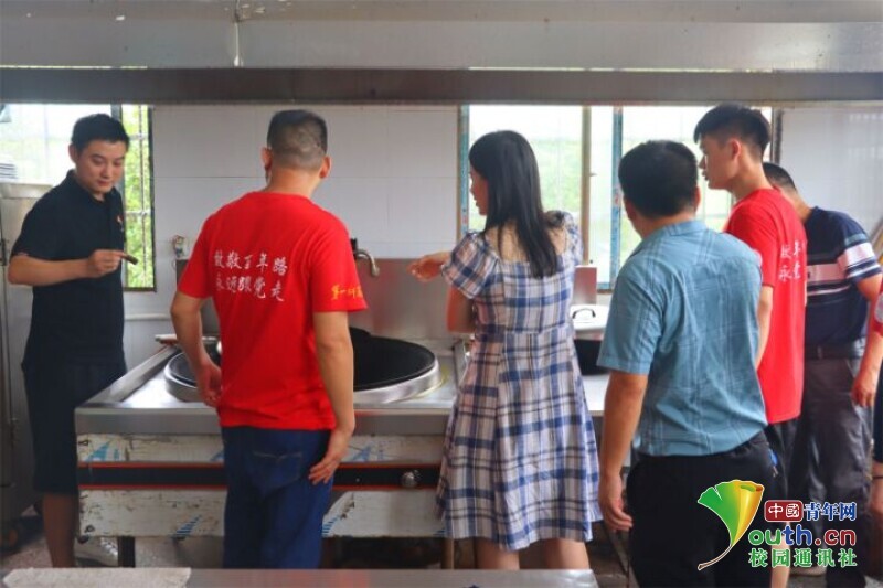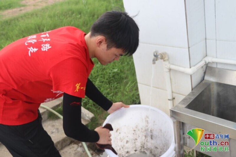 图为队员在带队老师的带领下,对于放假长久不用的食堂进行清洗和消毒,重点对厨具的消毒和垃圾的清理,切实确保食堂的卫生和整洁。中国青年网通讯员 段新利 摄