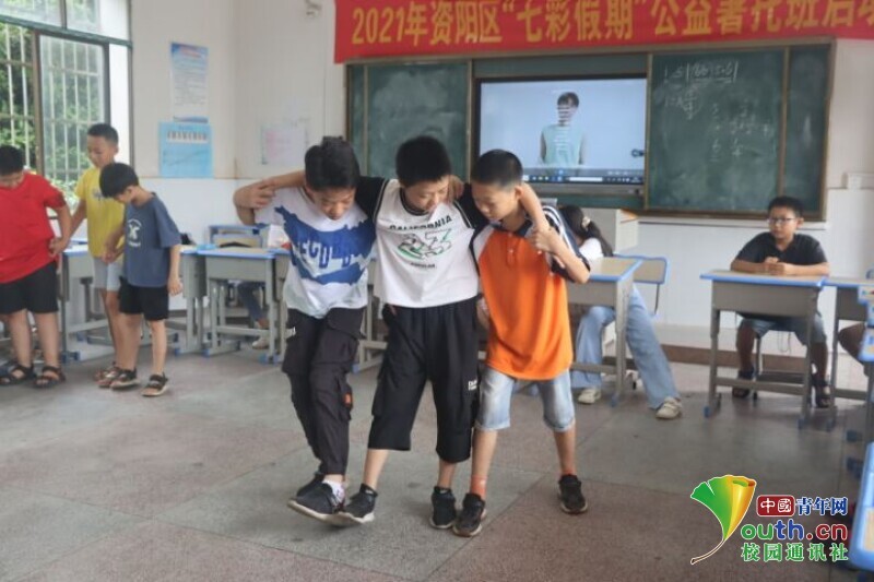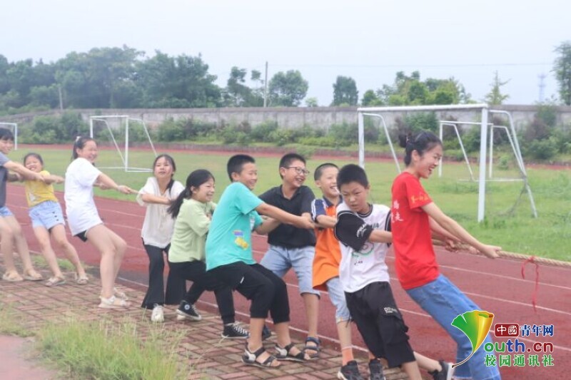 图为孩子们与志愿者一起齐心协力进行拔河比赛。中国青年网通讯员 欧阳健 摄