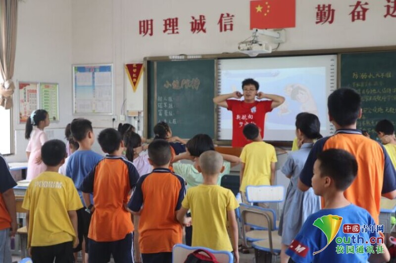 图为队员向学生讲授、演示游泳注意事项。中国青年网通讯员 段新利 摄