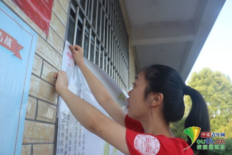 图为汇演开始前队员在张贴海报。中国青年网通讯员 段新利 摄