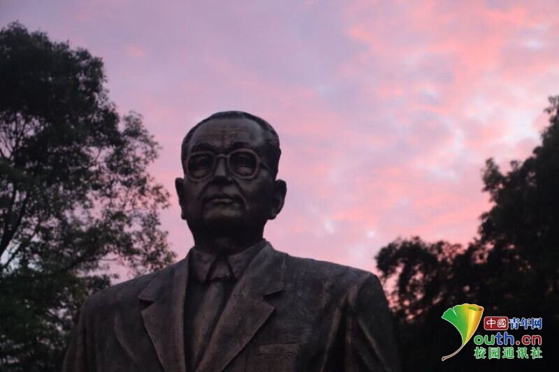 图为傍晚时,长塘仑小学内晚霞中的张国基先生铜像。 中国青年网通讯员 段新利 摄