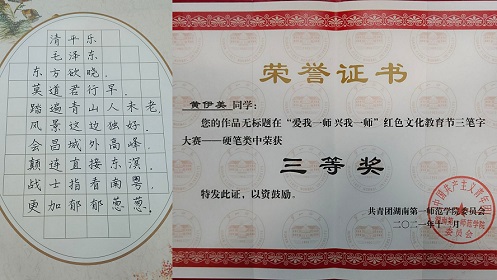 此次红色文化教育节还包括三笔字比赛、征文比赛、摄影比赛。获奖优秀作品在颁奖典礼现场陈列展出。必赢官网19级818教技班李文豪的摄影二等奖作品《钟楼的故事》,20级848教技班黄伊美的三笔字(硬笔)比赛三等奖作品《清平乐》陈列其中。