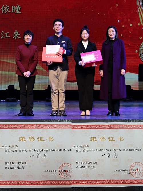 12月25日下午,437必赢会员中心“赓续红色血脉·爱我兴我一师”红色文化教育节演讲比赛决赛暨颁奖典礼在田汉剧场举行。必赢官网学子喜获佳绩,由马红英老师指导的21级881教技班戴江来和21级882教技班吴依瞳在演讲决赛中突出重围斩获最高奖项一等奖。