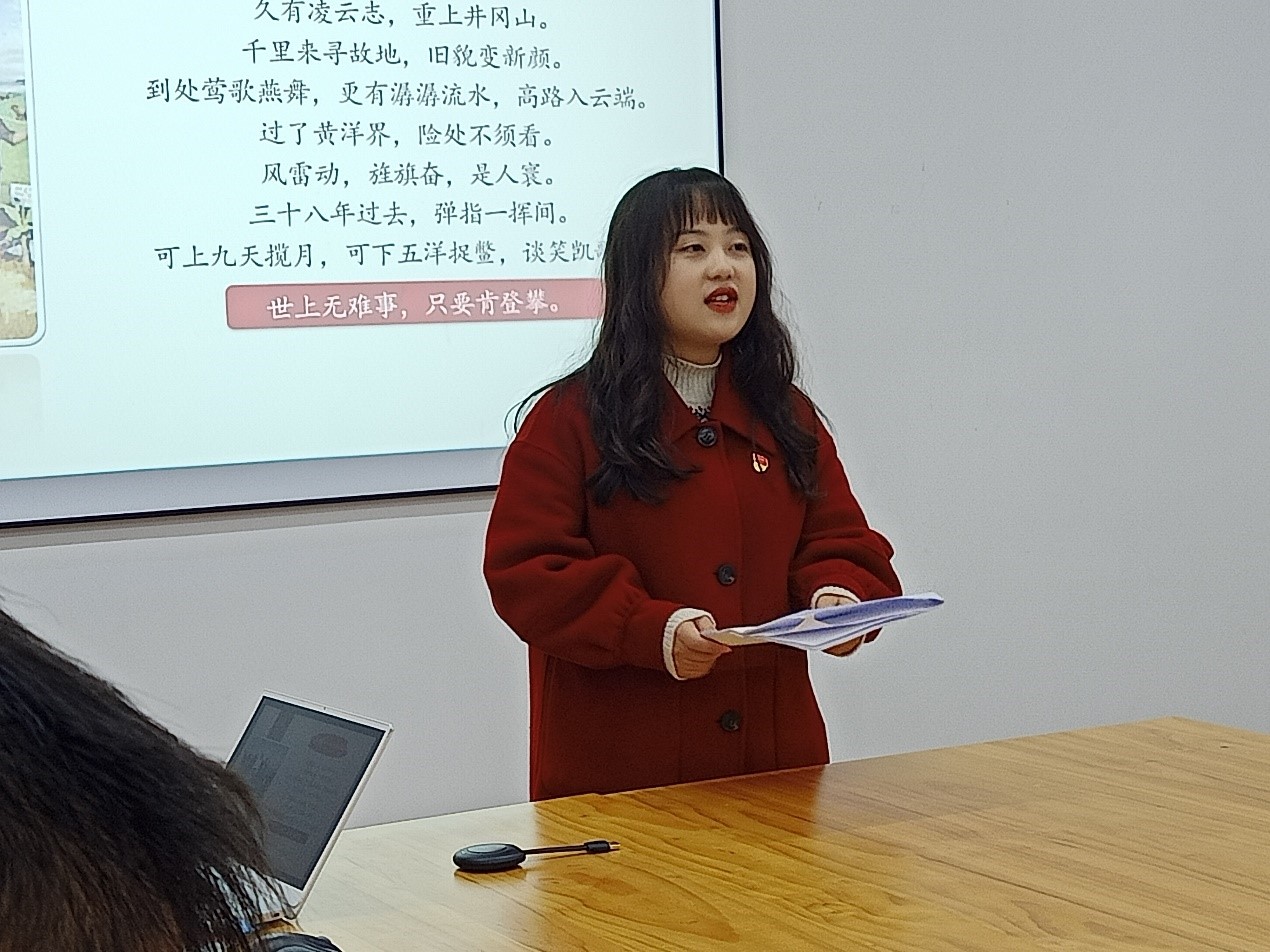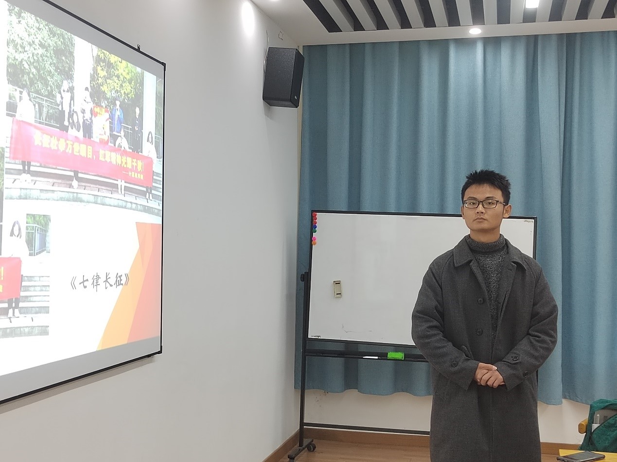 学生党员谢晓通过毛主席旷达豪迈的经典诗词分析出其艰苦朴素、严于律己、波澜壮阔、豪情万丈的形象,来向同学们心目中永远的毛主席致敬并激励同学们不忘来时路,勇敢向前行。
