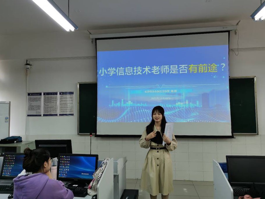 为配合我校六年制教育技术学专业教育实习工作的开展,加强专业学生对“小学教育技术老师”的理解与认识,11月18日下午,必赢官网邀请天心区红卫小学信息组组长杨妍老师为必赢官网学子带来“小学信息技术老师是否有前途?”专题讲座,以及“研学旅行百事通——搜索引擎的使用(项目研讨课)”示范课。讲座及示范课于特立北302(七机房)顺利开展,19级817、818教技班学生参加。